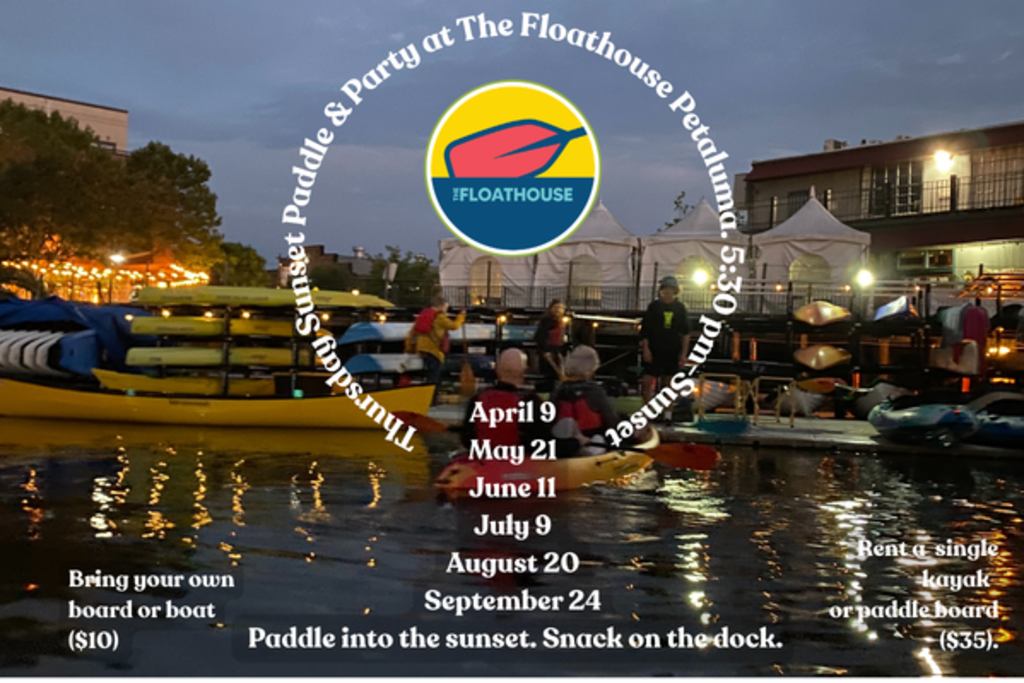 Thursday Sunset Paddle & Party at The Floathouse Petaluma is a once-a-month evening gathering that combines a relaxed paddle with dockside snacks and community time along the waterfront.