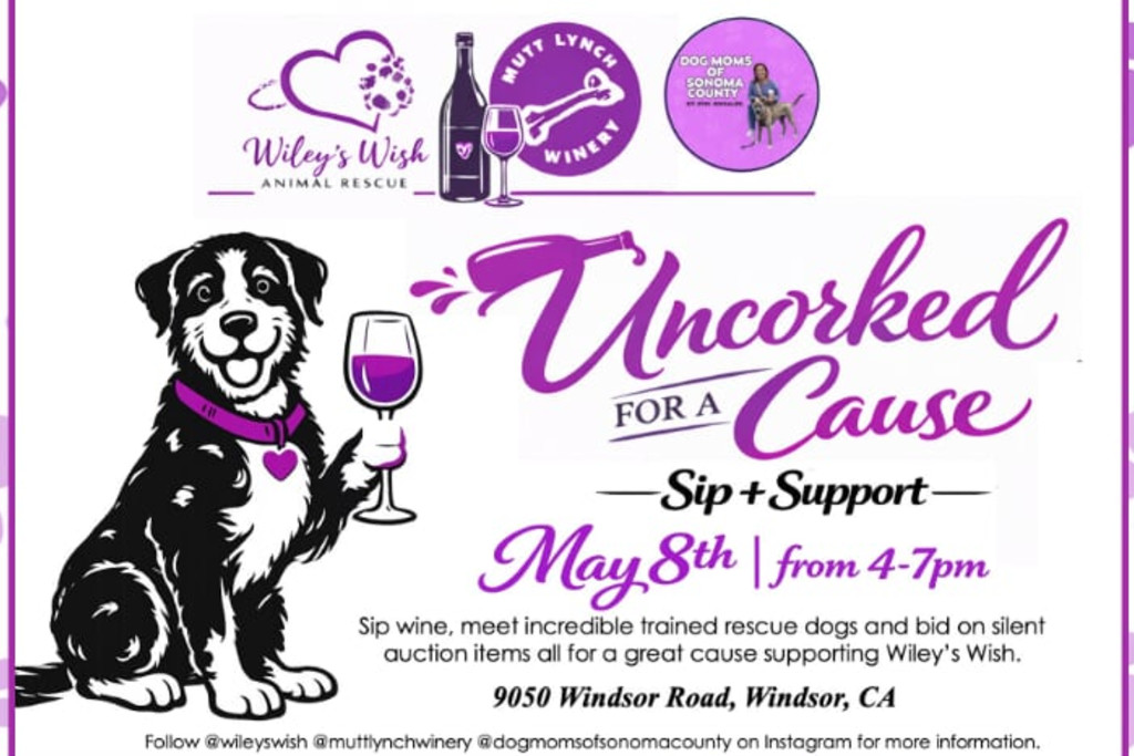 Wileys Wish, Mutt Lynch Winery, and Dog Moms of Sonoma County are coming together, and were so excited about Uncorked for a Cause.