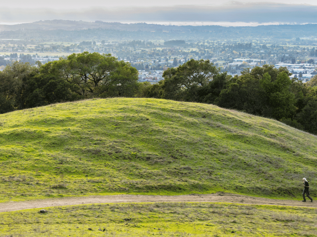 Hikers desiring a nature excursion without the leg burn can opt for the relatively flat Todd Creek Trail, but those seeking to challenge themselves by scaling the heights of this great mythological symbol will find several routes requiring varying degrees of exertion. Going for the summit is a great challenge to set, but if you’re more inclined, shall we say, to a metaphoric mountain climb, we suggest parking in the lot located on Petaluma Hill Road. From there, take the Red Tail trail entrance on the right. The steepness levels off after about a 15-minute climb, becoming more gradual and offering forks in the road with various loops depending on how high you want to go. A reasonable mid-exertion hike takes you to a surprising grassy plateau nestled between the hills, which is green in the rainy season and brings a rewarding sense of having traversed past rocks and wrangled oak trees to reach a fertile grassy sanctuary.